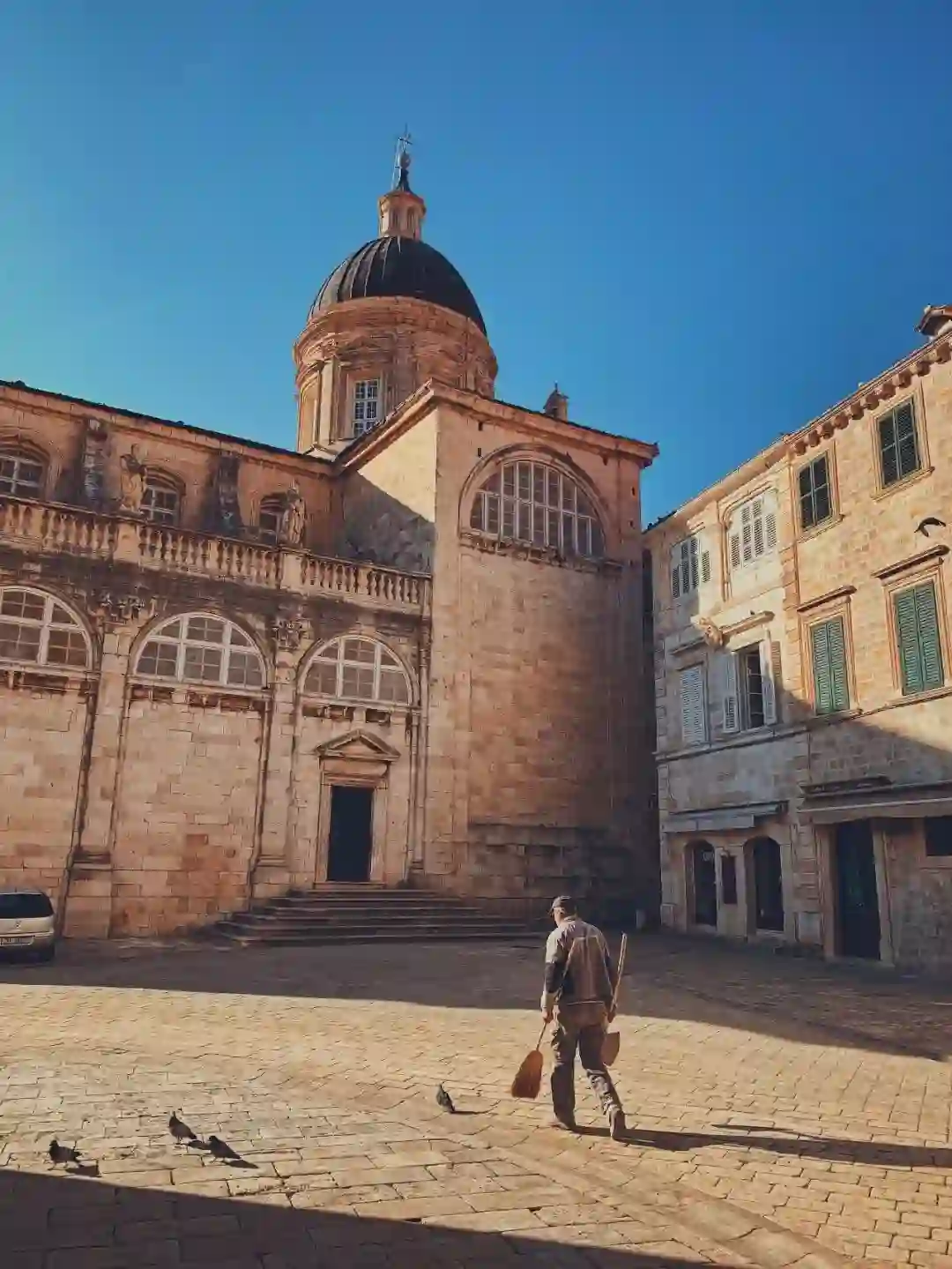 这是在君临城的清晨拍摄的一张作品,一位清洁工拿着扫帚从我面前走过,阳光洒在他的身上,鸽子在他身边觅食,这一切的一切都是这么的安静又美好,我随手从包里掏出手机,拍下了这一刻。