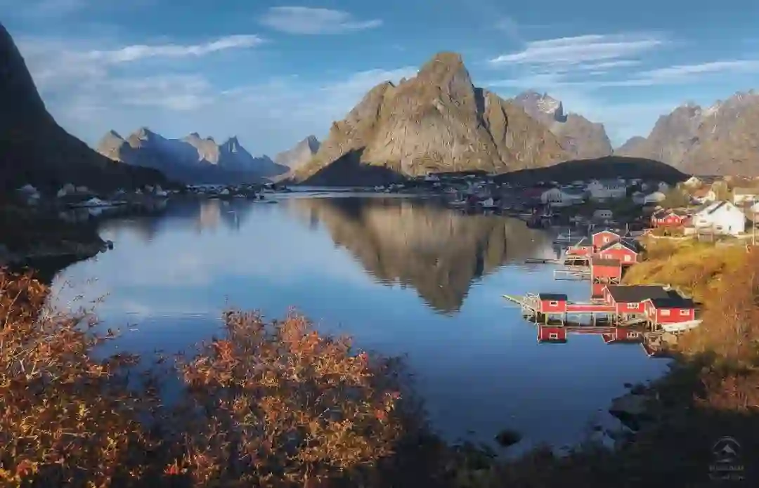 摄于挪威雷纳渔村,日落的柔和阳光洒在山峰和小岛上,精致的红色小房子成了最美的点缀。