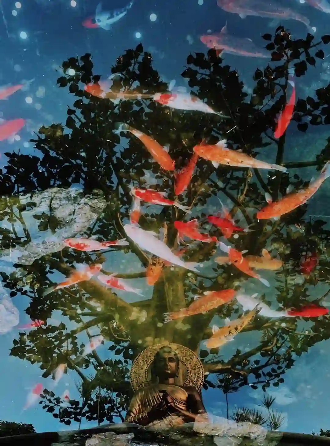 古刹内,菩提树下,金身佛像前,有一个小池塘,五彩斑斓的锦鲤与水面上佛像、菩提树的倒影相得益彰,形成一幅鱼游菩提树,万鲤来朝宗的奇景。