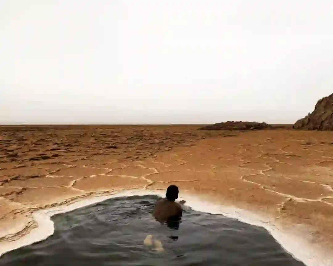 2018 年 7 月,埃塞俄比亚北部。一处盐矿具有相当特殊的地貌,散布在盐矿内有许多大小不一的水塘,一个当地人在一处小水塘内游泳,像极了一个私人泳池。