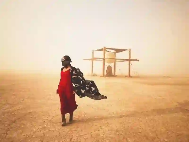 去年 8 月,我前往美国参加一个倡导自由与包容的节日,火人节。在这里一个临时城市从出现到拆除一共 7 天,我们带着现代人的意识形态回到社会最原始的状态,好像未来的人穿越时空来看当下的我们,而我每天沉迷于寻找沙漠中人们搭建的庞大装置艺术,在沙尘暴来临时被这些“艺术”所庇护。我在一座彩虹桥上看到两个人被困在了沙尘暴中,而风暴之后,他们和巨大的银球面面相窥,不知道是谁遇见了谁,我好像身处加西亚·马尔克斯式的魔幻现实主义中,从未感觉我们身处的世界是如此上不真实。于是我用手机拍下了这番景象。