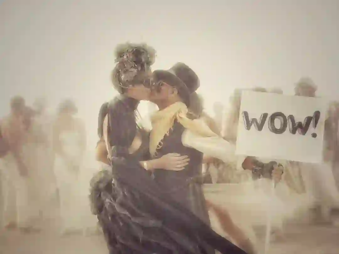 2017 年的火人节,我在荒漠中见到了这一对新婚的夫妇,他们穿着黑色的礼服,所有的来宾无论男女都穿着白色的婚纱。当沙尘暴来临的时候,新郎抱住了他的新娘,深情地吻了下去。