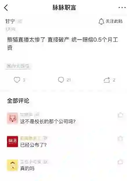 还有多名主播称熊猫欠薪,另据脉脉爆料,员工拿到的赔偿并不是 N+1,都是统一价:赔偿半个月工资。