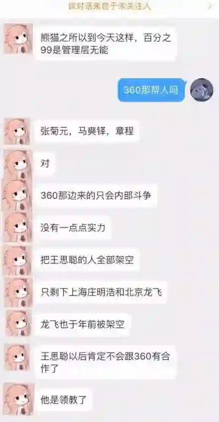 网上流传的截图称,“熊猫之所以到今天这样,百分之 99 是管理层无能”、“360 那边来的只会内部斗争”等。
