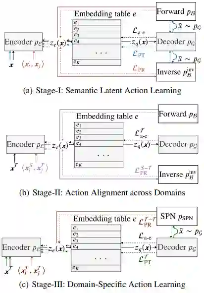 MALA 三段式整体框架,即语义隐动作学习、跨域动作对齐和特定域动作学习。