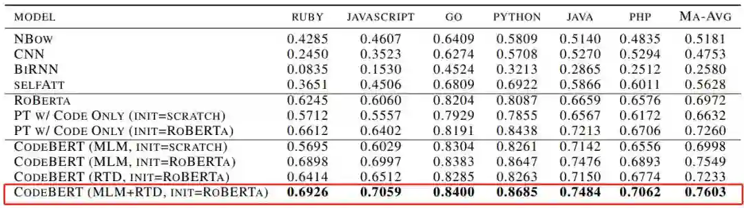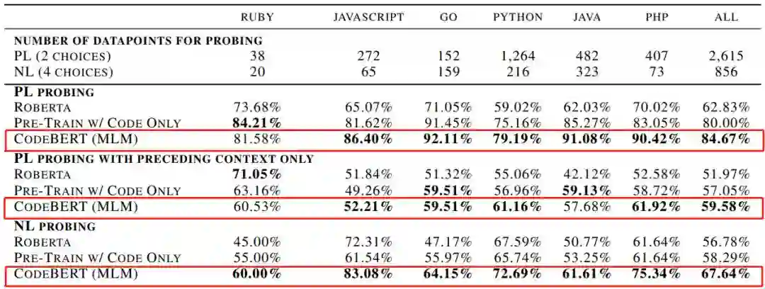CodeBERT 在 NL-PL 探测方面的性能也优于以前的预训练模型