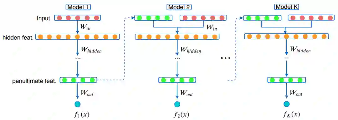 本文提出的 GrowNet 架构图。在第一个弱学习器之后,根据原始输入的组合特征和前一个弱学习器倒数第二层的特征来训练每个预测器。