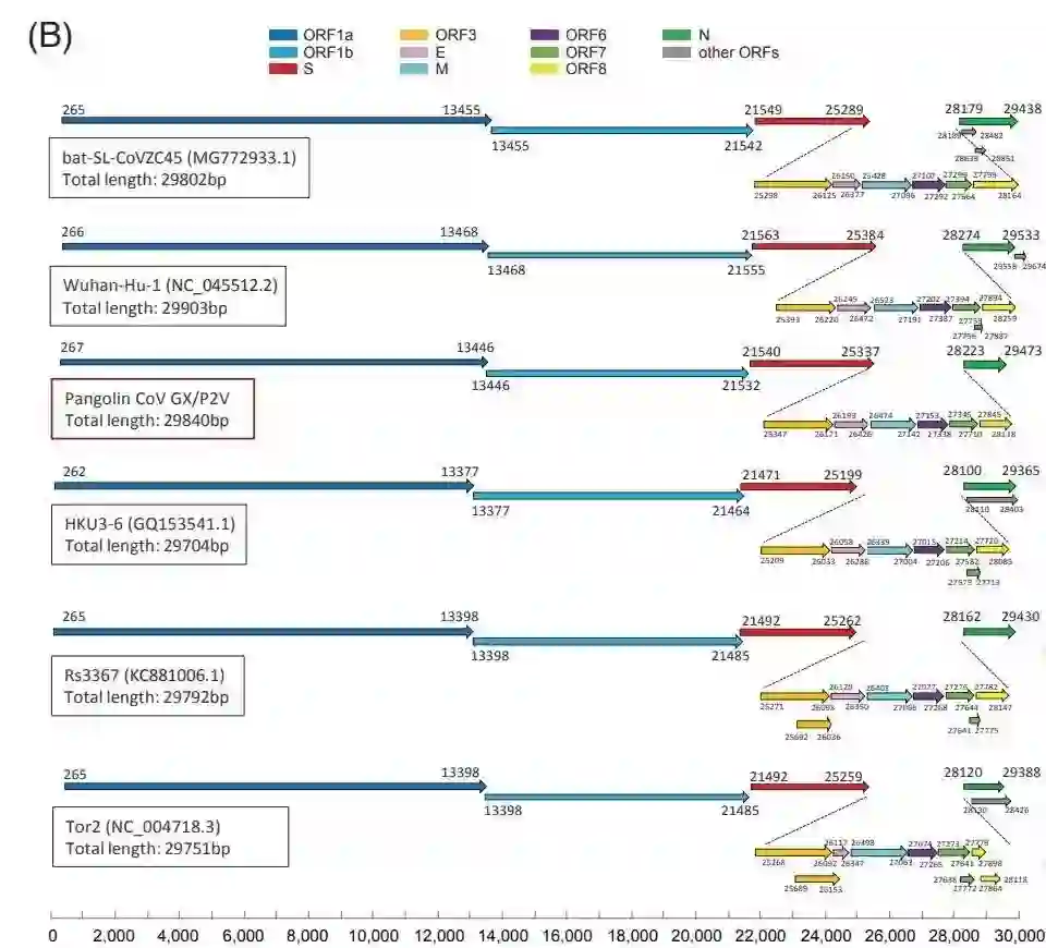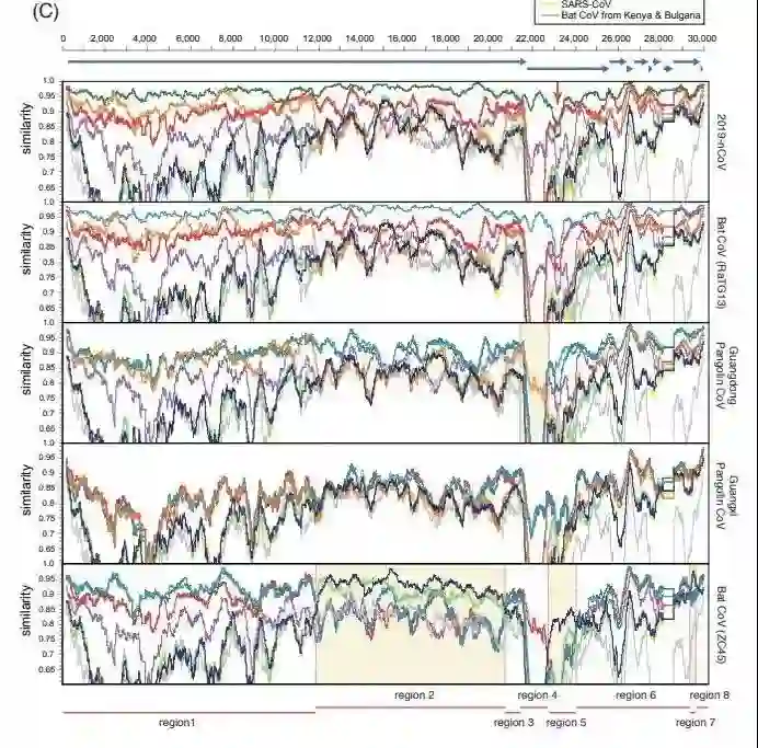 2019-nCoV 与广东穿山甲冠状病毒在受体结合域上表现出了非常高的序列相似性,尽管它的其余部分与蝙蝠冠状病毒 RaTG13 在病毒基因组方面的关系最为密切。