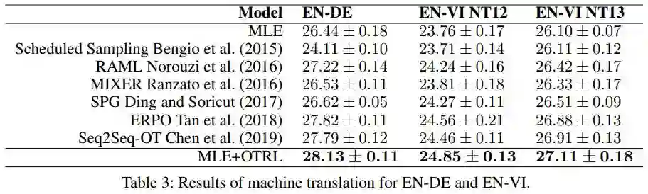 相较于其他基线模型,本文提出的 MLE+OTRL 模型在三个数据集上均实现了性能提升(机器翻译任务)。