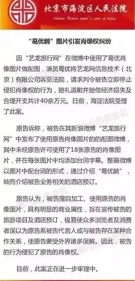 2016年12月,他将艺龙网信息技术(北京)有限公司诉至法院,后者因在官方微博中使用“葛优躺”表情作为配图,被法院判定“侵犯个人肖像权”,须赔礼道歉并赔偿相关经济损失40余万元。