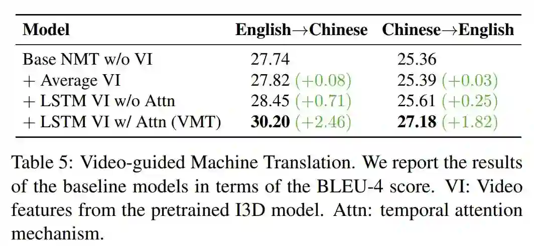 表 5 展示了 4 个不同模型在英中、中英翻译任务上的结果。Average video Features 模型和 LSTM Video Features 模型性能较 Base NMT 模型有所提升,这表明被动接收和考虑视频特征对于对齐源语言和目标语言是无效的。
