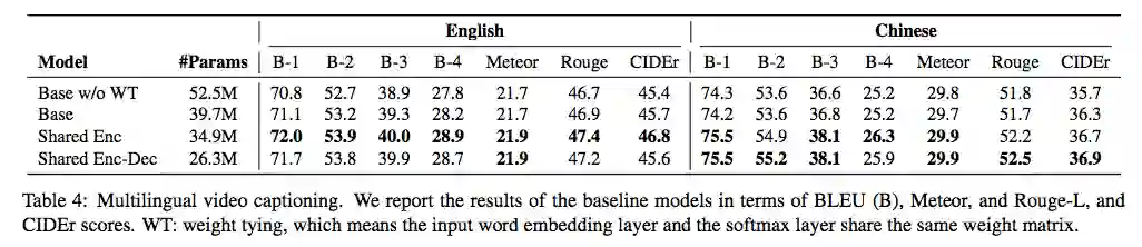 上表展示了三个基线模型在英文和中文测试集上的结果。多语模型(Shared Enc 和 Shared Enc-Dec)的性能优于单语模型 (Base)。这表明多语言学习通过共享视频编码器确实可以帮助视频理解(Shared Enc 模型的性能最优)。更重要的是,Shared Enc 和 Shared Enc-Dec 的参数量相比 Base 模型大大减少(分别减少了 4.7M 和 13.4M)。