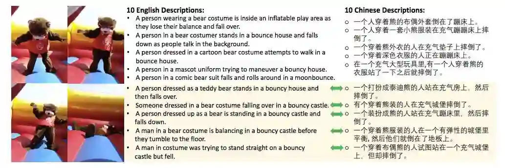 图 2:VATEX 数据集示例。该视频有 10 个英文描述和 10 个中文描述。所有句子均指向这一个视频,因此它们是彼此平行的,而后面五个中英文描述是彼此的互译版本。