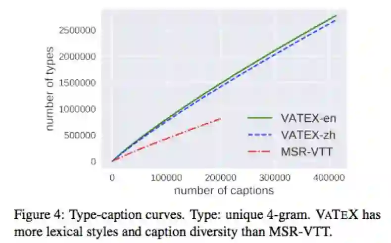 为了更直观地衡量词语丰富性和描述多样性,研究者提出了 Type-Caption Curve。如下图 4 所示,VATEX 数据集具备更强的语言复杂度和多样性。