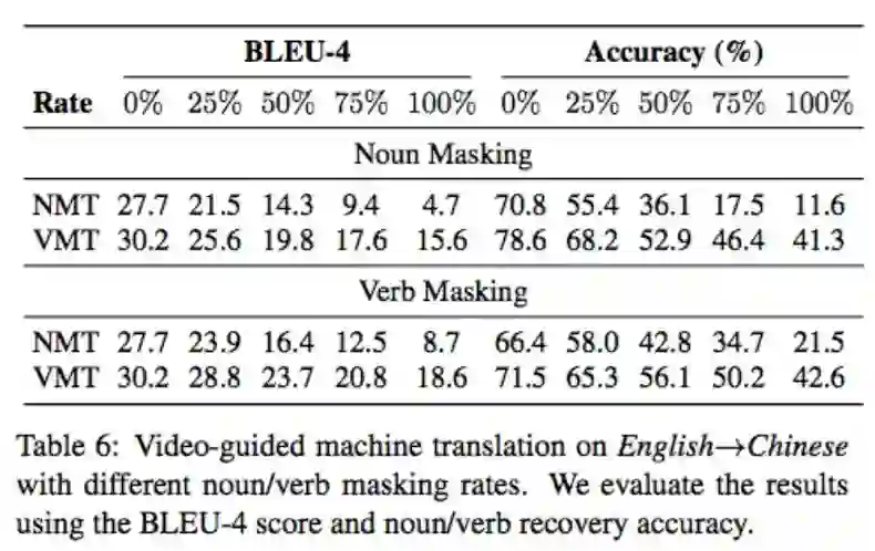 从上表中我们可以看到,VMT 模型的性能持续优于 NMT 模型。此外,随着 masking rate 增加,NMT 模型很难找出正确的名词/动词,而 VMT 可以依赖视频语境获得更多有用信息,因此二者在 recovery accuracy 上的性能差距显著增加。这表明,在 VMT 模型中视频信息对于理解主体、对象、动作及其关系有着重要作用。