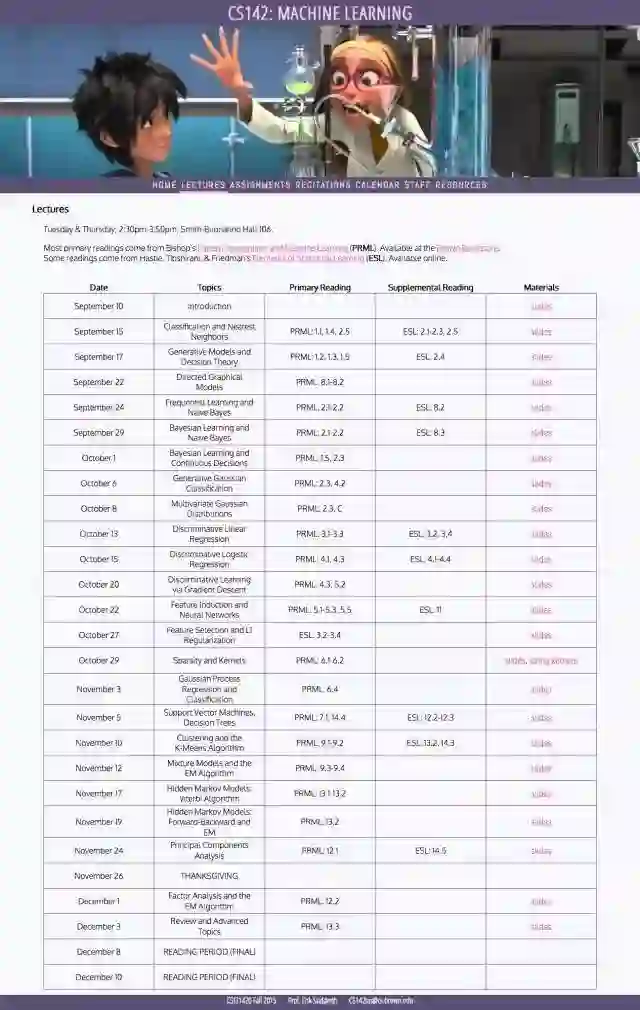 布朗大学 CSCI1420 《机器学习》 主要参考用书采用了 PRML,内容安排也和 PRML 一致,共 23 课。