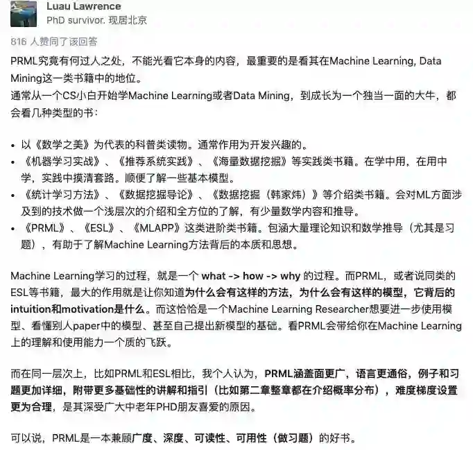 另外,知乎上关于这个关于“PRML 为何是机器学习的经典书籍中的经典?”的高赞回答或许会给大家一些启发: