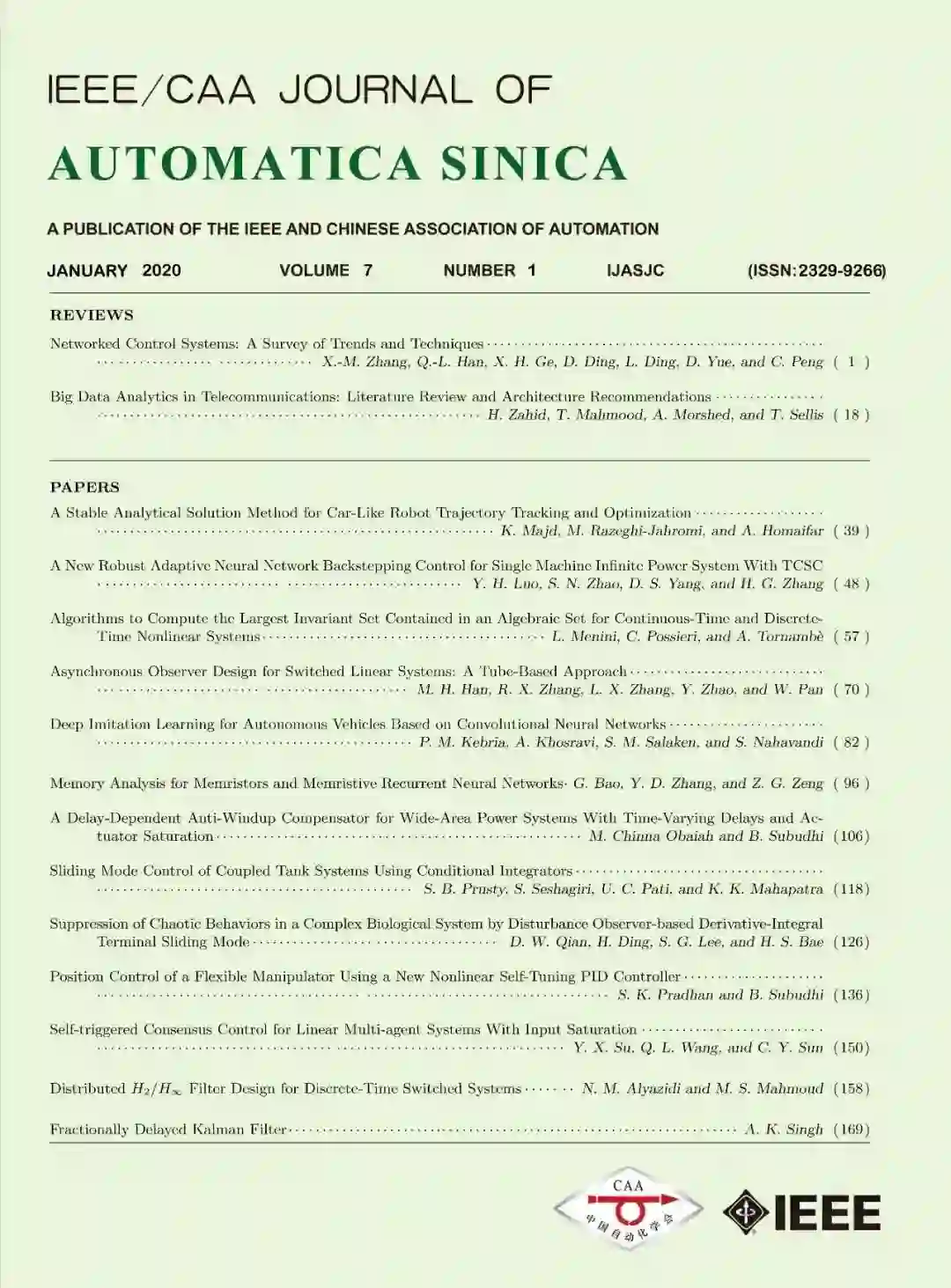 IEEE/CAA Journal of Automatica Sinica(《自动化学报》(英文版),简称JAS)报道自动控制、人工智能、机器人等领域热点和前沿方向的研究成果。目前,JAS被SCI, EI, Scopus等数据库收录,是中国科技核心期刊、ESI刊源期刊,是自动化与控制系统领域唯一的中国主办Q1区SCI期刊,也是谷歌学术计量自动化与控制理论学科TOP20出版物中全球最年轻且唯一中国主办的期刊。2019年,JAS首个SCI影响因子为5.129,在自动化与控制领域全球63种SCI期刊中排名第11(前17%),位列Q1区;最新CiteScore为11.2,排名前5%,位于所属各领域Q1区前列。JAS为中国科技期刊卓越行动计划世界一流重点建设期刊,自首次参评以来连年荣获“中国最具国际影响力学术期刊”称号。