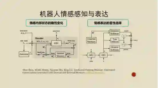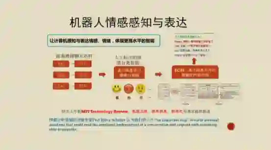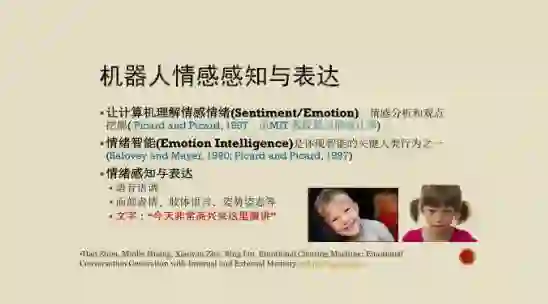 我们做的工作分布在几个方面,其中一个是怎么样让机器人表达情感和感知。比如说MIT在1997年提出来的情感计算,以及心理学研究中情绪的智能。它是一种很重要的人类的智能行为,而它要能够很好地去表达情绪上的响应。在某种程度上,这就是情商的一方面。