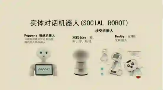 我们可以回顾一下虚拟的对话机器人,可以通过文字输入、输出,或者语音输入、输出的一个机器人,存在于网络世界而没有实体。从Eliza(做心理咨询的)到ALICE到QQ聊天机器人、小冰。还有很多实体机器人,比如说情感机器人Pepper,它是一个人形机器人,有一定的情感识别和表达能力,包括MIT的Jibo可以在家庭里执行一定任务,这些机器人可以进行一定的助理工作,同时还可以跟家庭成员进行一个有效的互动。