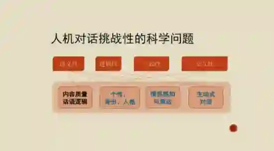 这样一些对话机器人真正进入到千家万户是一个非常难以解决的问题,具体体现在以下两个方面。第一,要真正理解它的语意很难。第二,它的逻辑非常重要。你对话的时候,有很多常识的问题、逻辑上的问题怎么样去解决?包括一致性的问题,交互性的问题,而你在交互过程中怎么能跟用户有很好的互动、情感的理解,也是研究里的一些重点。其中涉及到你怎么生成高质量的答复,我们前面演讲说判断一个文章是人还是机器写的,对话里也面临这个问题:怎么给它一个身份、个性、人格,包括怎么样去理解和表达情感,包括怎么样去主动跟机器进行对答,不仅仅是被动的应答。