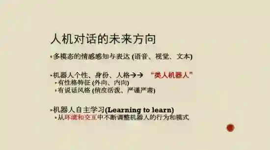 人机对话的未来方向,比如怎么去做类人机器人,你如何教会机器人学习记忆的时候,也在不断累积它的知识,这是很有意思和挑战的事。