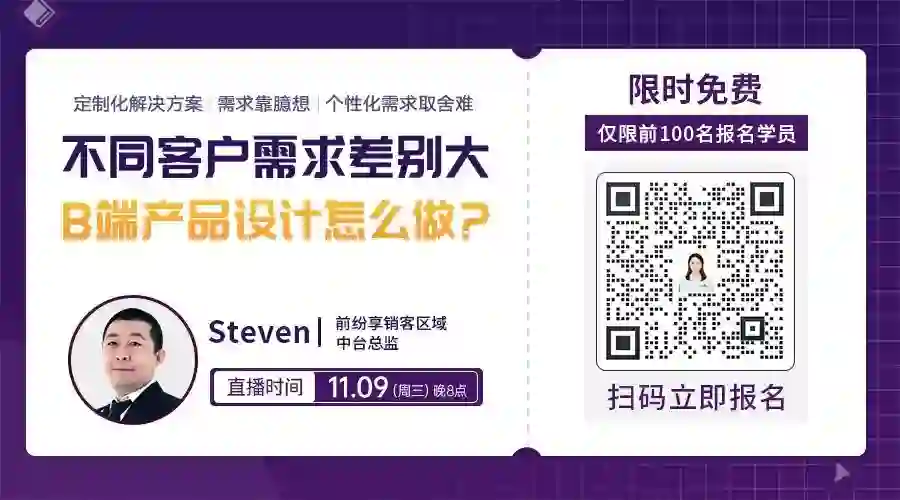 11月9日(周三)晚8点,前纷享销客区域中台总监@Steven老师 手把手教你破解B端产品设计3大难题