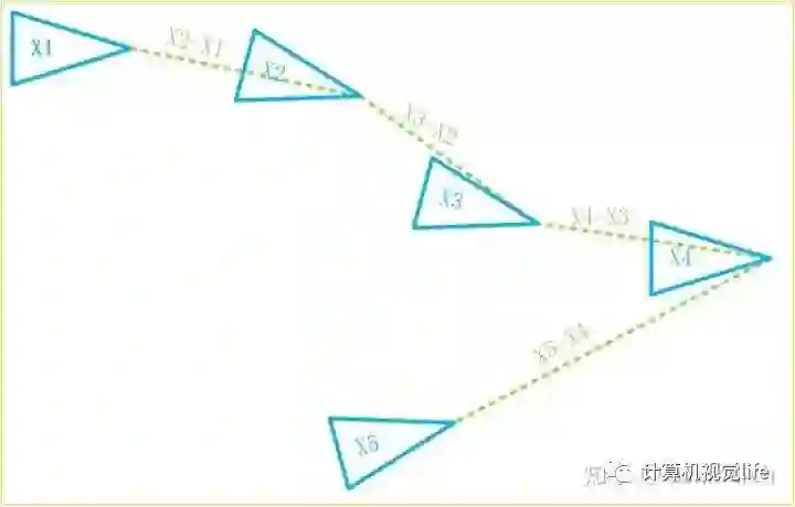 那现在又有新的问题了,我们怎么知道可以由第二帧推算第五帧位姿呢?就像下图,可能第一帧、第三帧也可以呀。确实,我们之所以用前一帧递推下一帧位姿,因为这两帧足够近,肯定可以建立两帧的约束,但是距离较远的两帧就不一定可以建立这样的约束关系了。找出可以建立这种位姿约束的历史帧,就是回环检测。