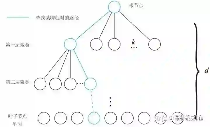 我们在每一层中都用K-means算法进行了聚类,分成了k个类,共有这样的d层(不包括根节点)因此在查找过程中,我们逐层向下,最终找到的叶节点也就是最终的单词。
