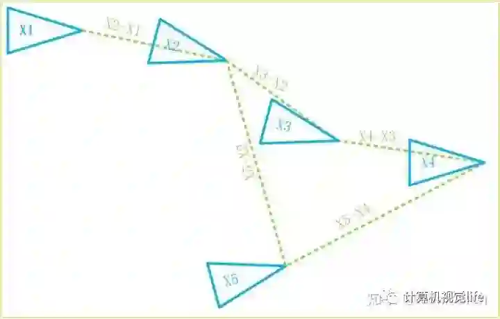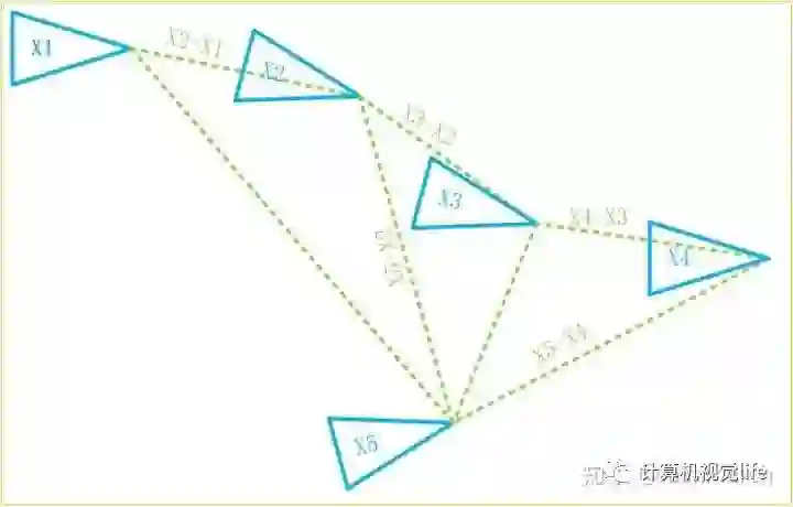 如下图所示,我们的位姿约束都是与上一帧建立的,第五帧的位姿误差中便已经积累了前面四个约束中的误差。
