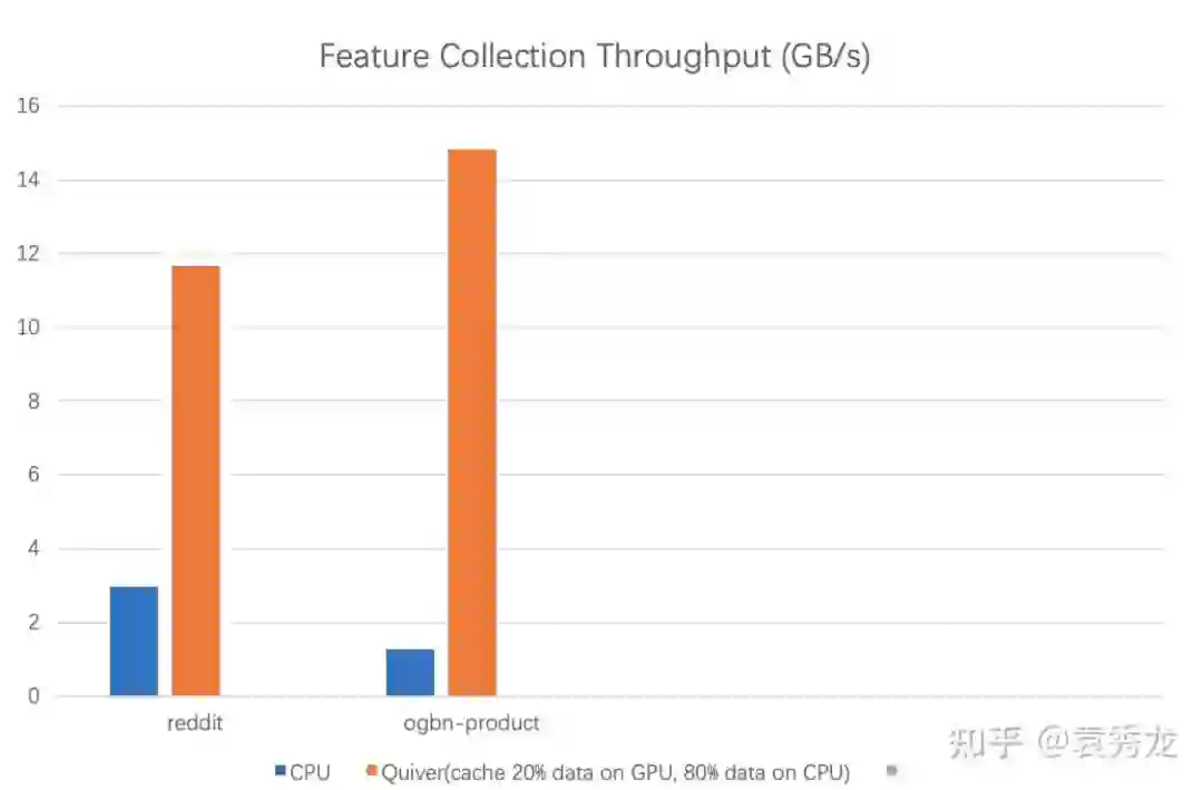 我们对这种方案进行benchmark特征聚合的吞吐,我们发现相比较CPU, Quiver完成特征聚合具有4-10倍的加速。同样,使用GPU做特征聚合带来的不仅是性能的提升,还有对CPU资源的需求缓解以避免多卡扩展时对CPU资源的竞争。
