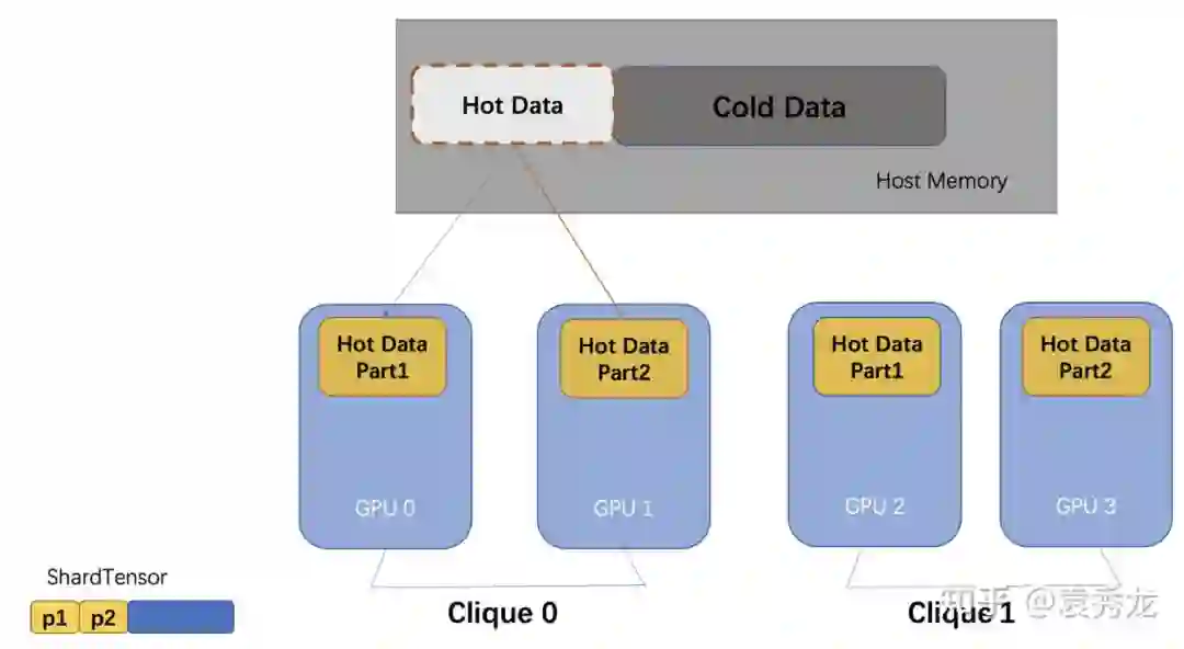 当我们有NVLink时,特征聚合的吞吐层次关系是:GPU本地显存 > GPU P2P With NVLink > PinMemory, 我们希望热数据能更多的命中本地显存和其他GPU显存。于是我们提出了p2p_clique_replicate策略,即当有NVLink时,一个NVLink团内(即该组GPU全部互相可以P2P访问)所有GPU共享缓存,p2p_clique之间仍然是热数据复制的策略。(要求p2p_clique之间对称)。