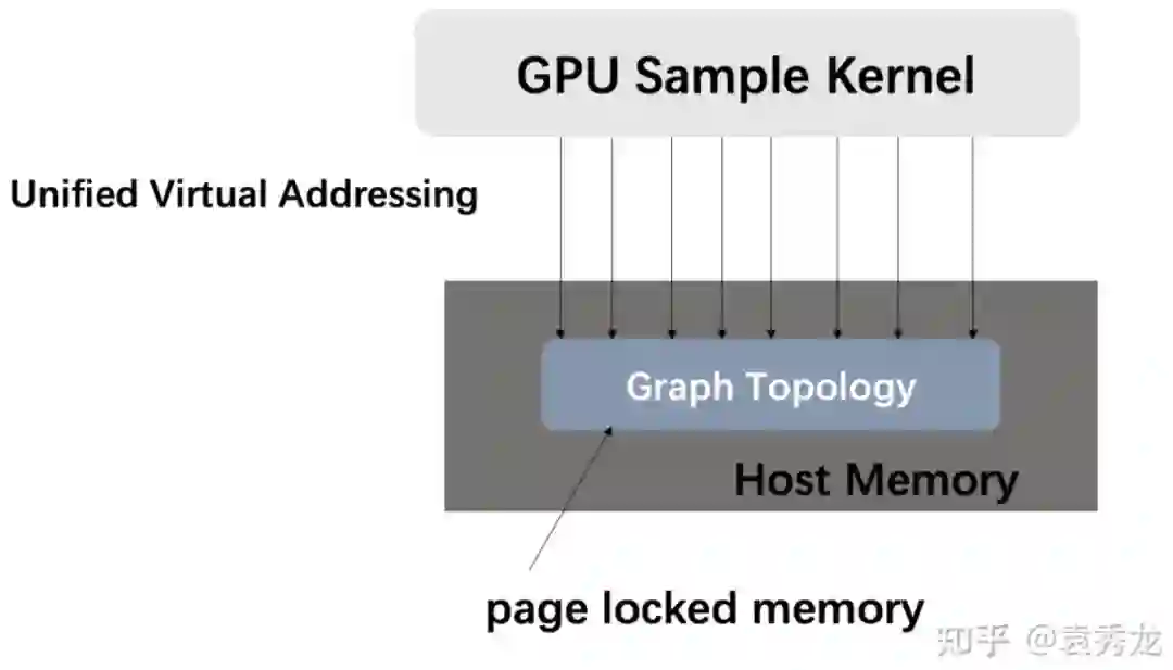 Quiver中向用户提供UVA-Based(Unified Virtual Addressing Based)图采样算子,既支持用户将数据放在GPU中进行采样,也支持在图拓扑数据较大时选择将图存储在CPU内存中的同时使用GPU进行采样。这样我们不仅获得了远高于CPU采样的性能收益,同时能够处理的图的大小从GPU显存大小限制扩展到了CPU内存大小(一般远远大于GPU显存)。