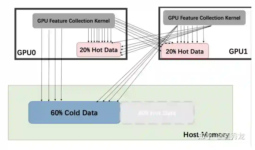 使用UVA采样带来的好处不仅仅是采样的加速,更是缓解了对CPU计算资源的需求使得多卡扩展性得到了极大的改善,为了避免歧义,我们下文中所有的UVA Sample都指的是数据存储在Host Memory中,接下来我们重点介绍对于特征聚合吞吐的优化。