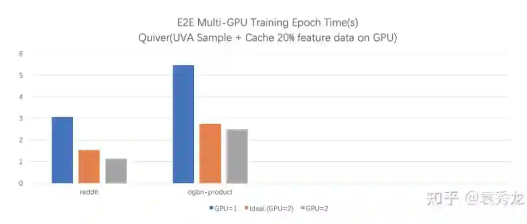 这两点带来的最终端到端的结果是,我们在一个具有NVLink的两卡机器上训练ogbn-product数据集达到了超线性加速比。quiver提供了非常简单易用的API设计,方便用户只需要修改cache_policy参数即可切换使用两种不同的多卡缓存策略。
