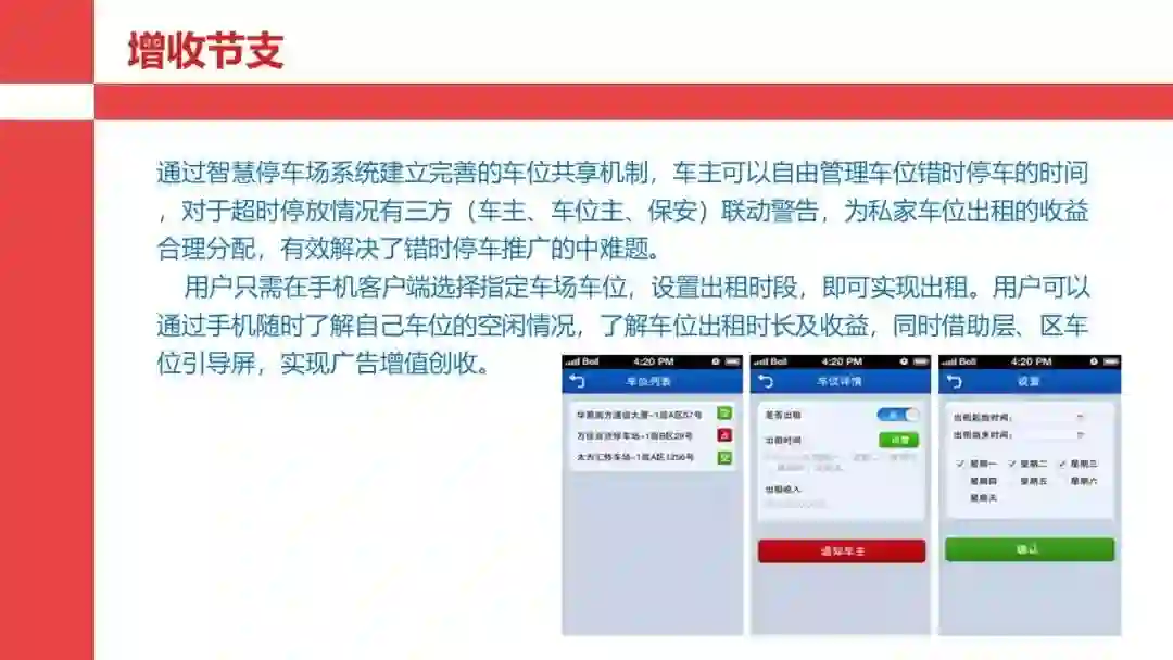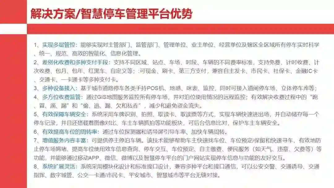智慧停车管理系统是基于手持智能终端(POS机)、车位车辆探测器(地感)、监控、智能卡(金融卡/第三方支付)、多渠道信息发布、智能道闸、智能立体停车等前端设备、设施通过无线(GPRS/2.xG/3G/4G/WIFI/自组XX)或有线网络及后台管理系统实现对临时占道停车、各种道闸封闭式停车场及立体停车库等统一管理的综合服务平台。