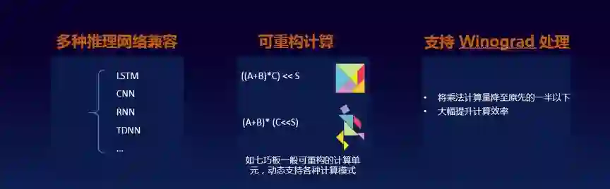 较 1.0 版本相比,DeepNet 2.0 首先是兼容性更好,可支持 LSTM、CNN、RNN、TDN 等网络;其次是支持可重构计算,DeepNet2.0 计算单元可以拼接应对计算模式,模式切换也可以快速组合,用单条指令来计算公式;第三是支持 Winograd,芯片做乘法的耗时远远高于加法,基于这一点,Winograd 把乘法耗时降低为原来的 1/2,进一步提升效率。