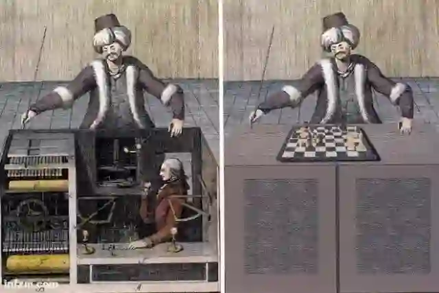 “土耳其人”在欧洲巡演了几十年,最后被人发现是个彻头彻尾的假货:那个装置里总是有个活人,而且是个下棋高手。肯佩伦只是发明了个魔术而已。那时的水平,想造台会下棋的机器,门儿都没有。