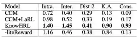 Baseline模型:1. CCM:基于图注意力机制的知识对话模型;2. CCM+LaRL:本文对一个基于隐变量以及RL的对话模型(LaRL)进行了改进,使用了CCM中的两个图注意力机制使得LaRL可以充分利用知识图谱。