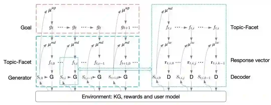 KnowHRL是一个基于知识的三层强化学习模型。具体来说,对于第一个子任务,上层策略学习遍历知识图(KG),以规划显式目标序列,从而在对话一致性、主题一致性与用户兴趣之间取得良好平衡。对于第二个子任务,中间层策略和下层策略协同工作,借助目标完成机制,围绕给定话题的同用户进行深入聊天。