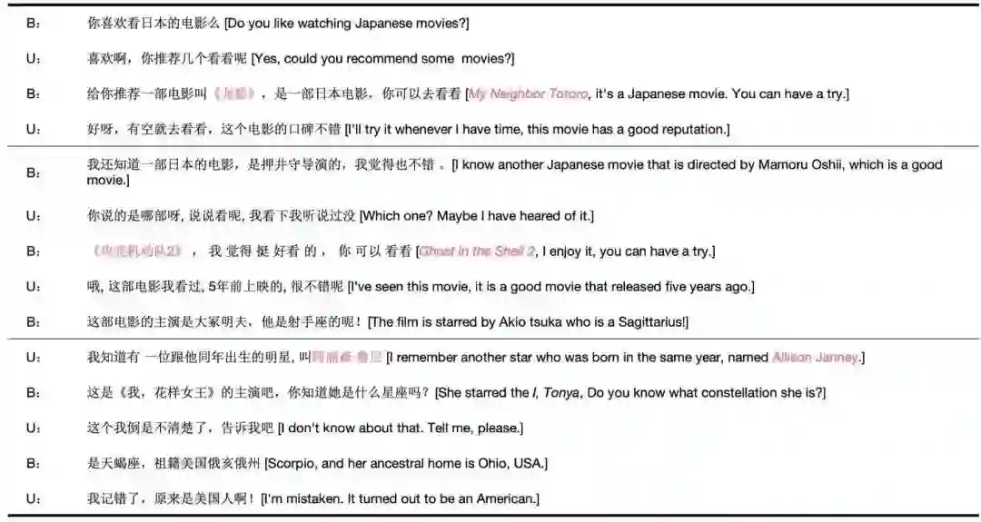 数据集:DuConv数据集包含30k对话Session,其中对话轮数为120k。本文将数据切分为训练集(100k轮对话)、开发集(10k 轮对话)以及测试集(10k轮对话)。该数据还提供了电影、明星领域的知识图谱,由人工进行标注,每个对话Session最终需要引导到一个预先给定的实体,并且对话需要围绕知识图谱中的相应知识进行。