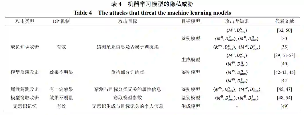 差分隐私机制从定义上防止成员猜测攻击, 模 型记忆, 并弱化属性猜测攻击。但是, 其对模型反演 攻击和模型窃取攻击的弱化效果不明显。具体可参 考 Liu 等人[38]的研究。表 4 总结了以上提到的五种 攻击以及差分隐私对它们的抵抗能力。