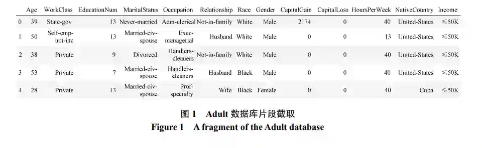 首先, 本文举例描述数据分析任务场景以及可 能存在的隐私威胁。图 1 为 Adult 公开数据库的片段 截取示例。在 Adult 数据库中, 每一行代表一条个人 (隐私)信息。数据分析者想要分析数据库中所包含的 模式规律。例如, 统计问题“数据库中有多少人的信 息满足属性P?”属性P可以是“年收入超过50K?” 或者“年龄超过 50 岁”, 或者两者的交集。机器学 习二分类任务可以是“基于个人的其他信息预测该 人的年收入是否超过 50K”。