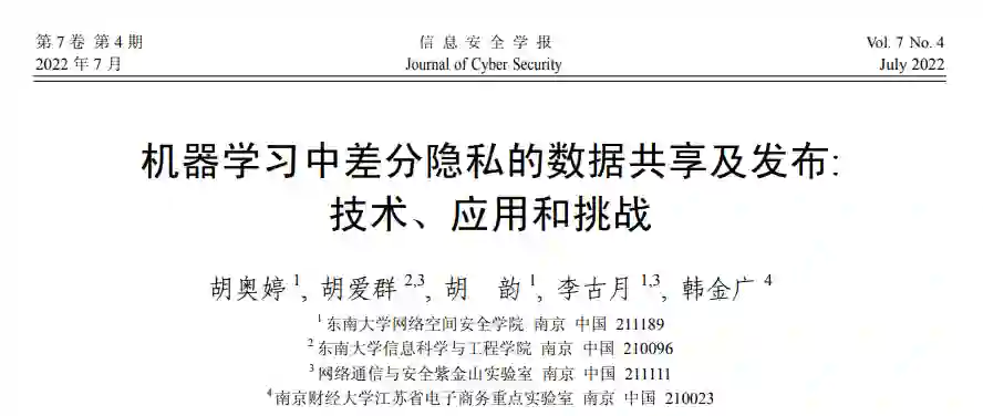 近年来有以下与差分隐私相关的综述性分析。在这些综述分析中, Dwork 等人[2]首先给出隐私保护 分析中存在的问题以及初步的差分隐私解决方案。Dwork和Roth[15]总结了到2014年为止差分隐私出现 的理论性技术。Sarwate 和 Chaudhuri[7], Ji 等人[16], Goryczka 等人[17]和 Jain 等人[18]分别强调信号处理、 机器学习、多方安全计算、大数据中存在的差分隐 私问题。Zhu 等人[19]介绍了差分隐私的数据共享和分 析, 与本文目标类似。然而近年来, 随着差分隐私技 术及机器学习技术的迅速发展, 许多新的理论突破 和实践层出不穷。因此本文将涵盖更多新发展的技 术和问题。