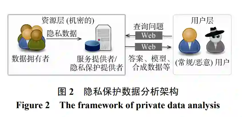 本文旨在帮助读者迅速了解差分隐私的进化发 展历程, 并熟悉差分隐私机制的在机器学习领域的 应用。图 2 给出常见的隐私数据分析场景架构, 其中 数据拥有者提供敏感数据集; 服务提供者, 例如机 器学习服务提供商(Machine Learning as a Service, MLaaS)负责数据分析和以及用户隐私保护; 常规用 户旨在获取查询结果, 同时恶意用户可能成为窃取 隐私信息的攻击者。后文结构如下: 第 2 节介绍差分隐私的定义、实 现机制、常用性质定理; 第 3 节介绍机器学习领域热 门的威胁模型、攻击以及与差分隐私的联系; 第 4节介绍差分隐私机制在机器学习中两种热门模型: 鉴别模型 (discriminative model) 以及生成模型 (generative model)中的运用; 第 5 节总结差分隐私在 机器学习领域应用存在的公开问题和研究方向。