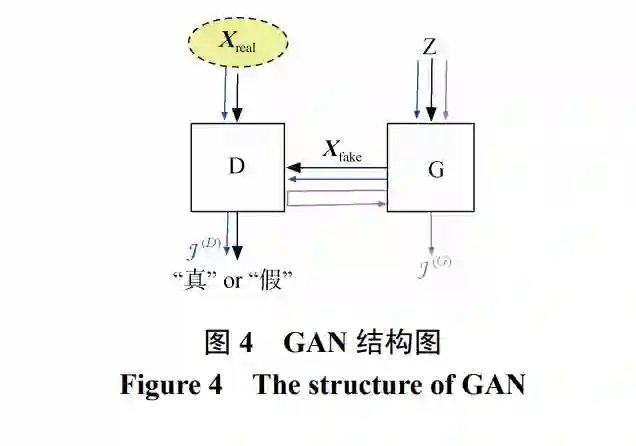生成模型有多种, 本文专指对抗生成模型 GAN。GAN 有很强的分布模仿能力, 能够生成与原始训练集分 布近似的高纬度数据集。因此许多研究者用其当作天然 的规避隐私保护的方法, 生成并发布合成数据集, 并用 人工合成数据集替代隐私数据集发布使用。但是近年来 研究发现GAN本身并没有严格证明的隐私保护性能, 特 别的, 成员猜测攻击对GAN 也有攻击效果[40, 42-43, 45, 68]。根据第 3 节, 差分隐私机制能够抵抗成员猜测攻击, 因 此研究差分隐私的 GAN 对于隐私保护至关重要。GAN 基本知识: GAN 的基本结构如图 4 所示,