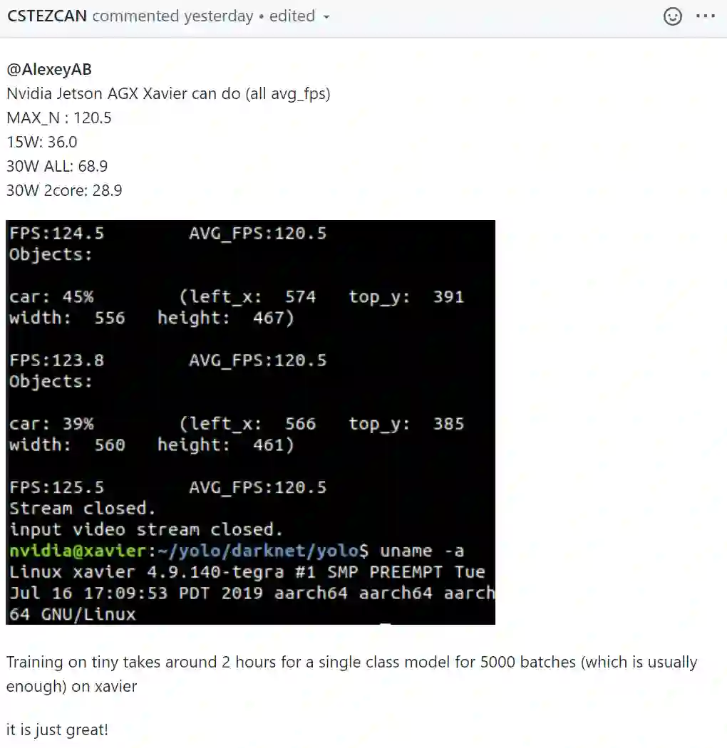 国外已经有网友亲测了YOLOv4-Tiny,并在Titan XP、Jetson AGX Xavier两个设备上测试,结果如下: