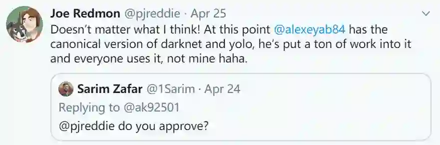 关于YOLOv4是否是YOLOv3的真正"继承者",我想没有人比Joe Redmon(YOLOv1-v3作者)回答更合适了,他在twitter上的回复内容如下: