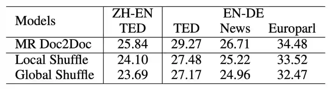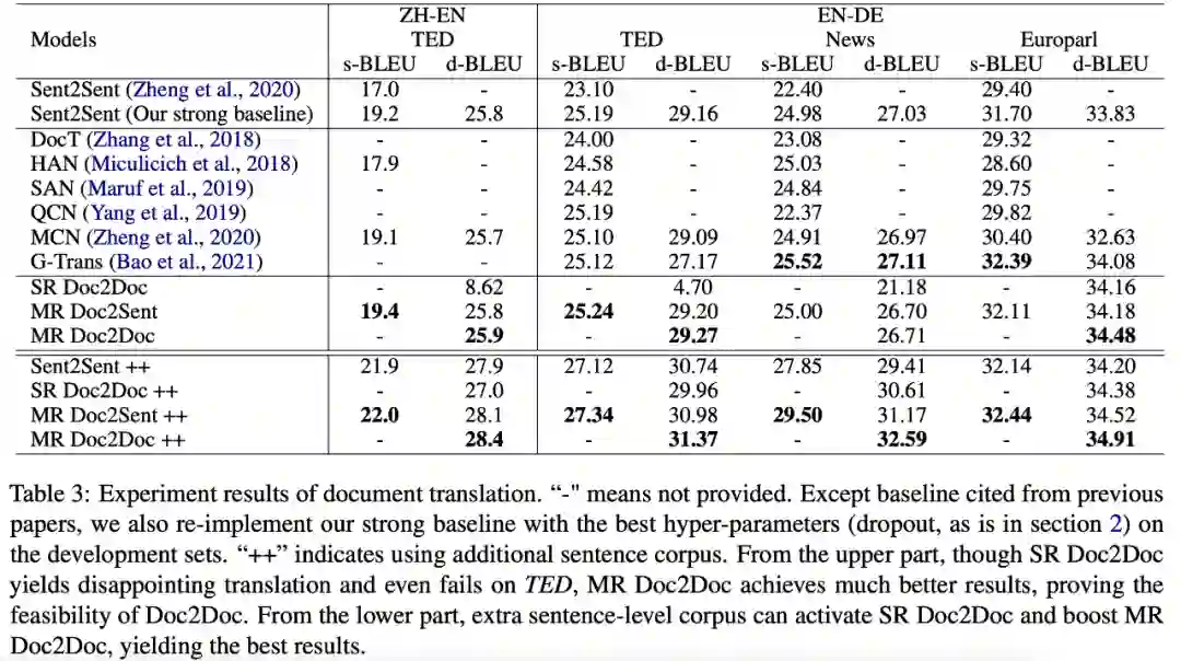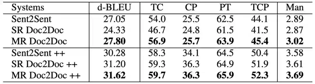 与上述对应的,「篇章到篇章」的翻译利用了完整的源端与目标端信息,可以使用任意的平行语料,且不引入任何的额外参数,具有较明显的优势。