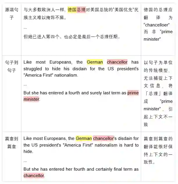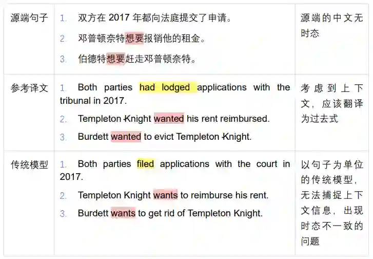 而当前的机器翻译模型主要以句子作为翻译的基本单位,逐句逐句地进行翻译。这类方法的问题显而易见:无法有效捕捉到上下文的信息,在翻译的过程中容易出现与上下文不一致、引用错误等问题,如下面这个例子: